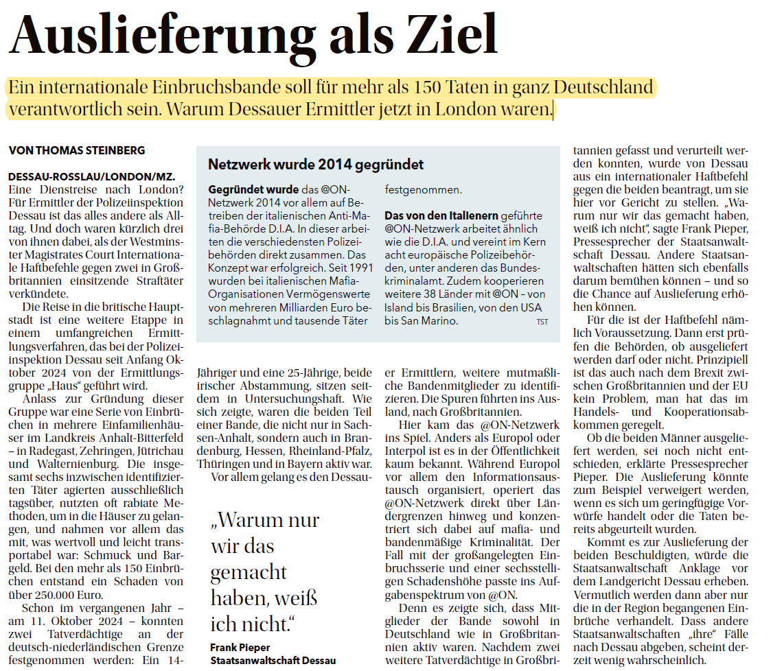 Il caso operativo “EG Haus” condotto dalla Polizia tedesca in collaborazione con il collaterale del Regno Unito e supportato da Europol e dalla Rete @ON riguarda un gruppo criminale di 6 persone anglo-irlandese responsabili di oltre 150 furti in abitazioni in Germania. Due dei predetti criminali sono stati arrestati ad ottobre 2024, mentre gli altri quattro sono destinatari di mandati di arresto europeo, due eseguiti a Londra lo scorso 11 ottobre e due tuttora latitanti.